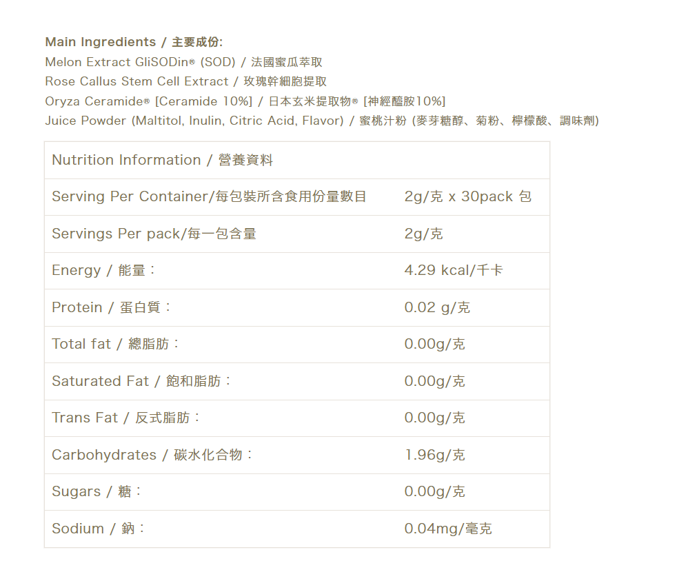 | Ingredients | GliSODin® French patented cantaloupe extract ‘Super Enzyme SOD’: Clinically proven to be the top component of the antioxidant pyramid, it is a natural plant active ingredient extract. It is the world’s first clinically proven orally effective and ‘SOD that can be absorbed by the digestive system’. It neutralizes millions of free radicals causing aging in one second, and defeats problems derived from free radicals such as dehydration, fine lines, relaxation, and dullness in one step. Its antioxidant power is 8000 times and 20 times higher than vitamin C and astaxanthin, respectively. Japanese patent Oryza Ceramide® Ceramide (Ceramide or Molecular Nail): The only ingredient in Japan that has been clinically proven to have both moisturizing and whitening effects. It can replenish moisture in the skin layer, enhance the skin barrier to prevent moisture loss, and at the same time inhibit the proliferation of brown spots and improve skin tone. 1.16 tons of high-quality Japanese brown rice can only extract 1 gram of ceramide, concentrated essence, rare and precious. High-concentration extraction of Bulgarian Damascus rose stem cell extract: A world-renowned nourishing ingredient, known as ‘liquid gold’, has unique activity and various nutrients. It has effects on protecting skin cells, promoting the regeneration of epidermal cells, improving the skin’s resistance to ultraviolet rays, and anti-inflammatory. It is suitable for people with sensitive and fragile skin, people whose skin is prone to redness, whether adults or children. Various ingredients work together to comprehensively improve the skin’s resistance to ultraviolet rays and peroxides. The ingredients are sourced from Japan, France, and Bulgaria, safe and reliable, with no additives. ❌ No added sugar ❌ No nuts ❌ No dairy products ❌ No soy ❌ No preservatives ❌ No mercury ❌ No impurities ❌ No pesticides |